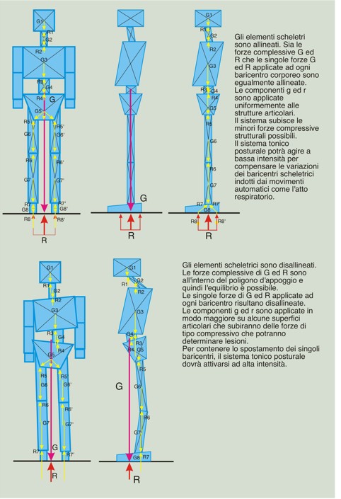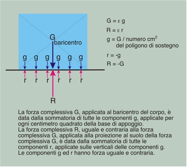 Every part of the human body has its own center of gravity and the center of gravity of the body is the result of the sum of each of them. To each individual center of gravity the force G and the counterforce R are applied.