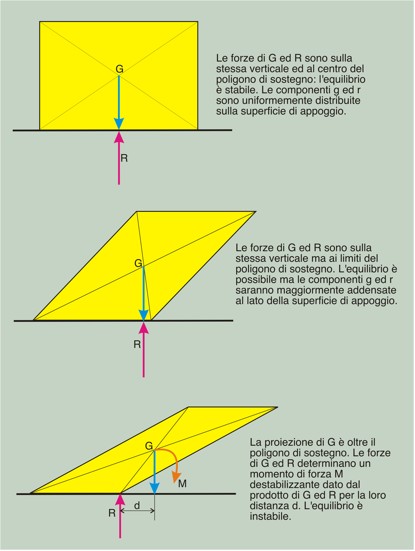 A body is defined as being in stable equilibrium when the two forces are on the same vertical and at the center of the support polygon. When G and R are on the same vertical but at the edges of the support polygon, equilibrium is possible but the forces g and r, instead of being distributed, converge at a point. When the two forces are not on the same vertical, a moment of force is created that makes the equilibrium unstable.