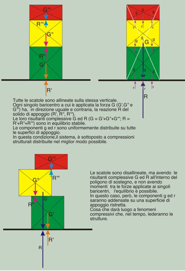When multiple boxes are stacked, each box reacts with the one below. The overall equilibrium will be determined by the mode of alignment. Each single box will have the forces G and R applied and the overall forces of G and R will be given by their sum. The components g and r will be applied and distributed over all support surfaces. If the alignment of the boxes is not on the same vertical but is still such as to allow equilibrium, the forces g and r will be concentrated at certain points, causing compressive structural phenomena.