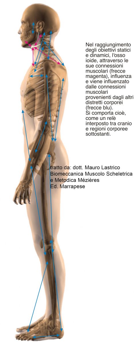 The hyoid bone, through its musculo-fascial connections with the skull, mandible, sternum, scapula, larynx, and pharynx, constitutes the support point for jaw opening movements, participates in swallowing, phonation, and respiration, and is involved in the positioning of the skull and scapula.