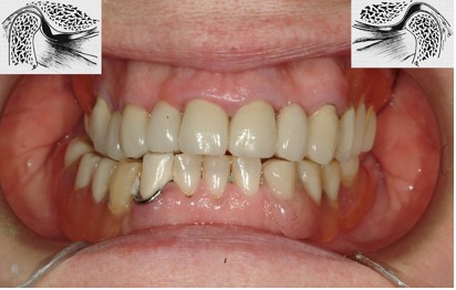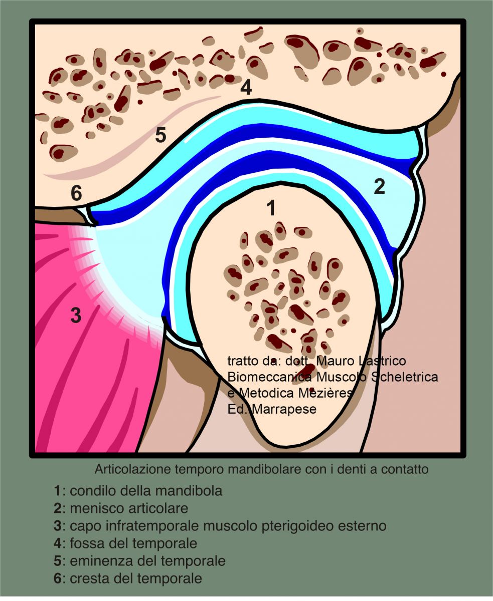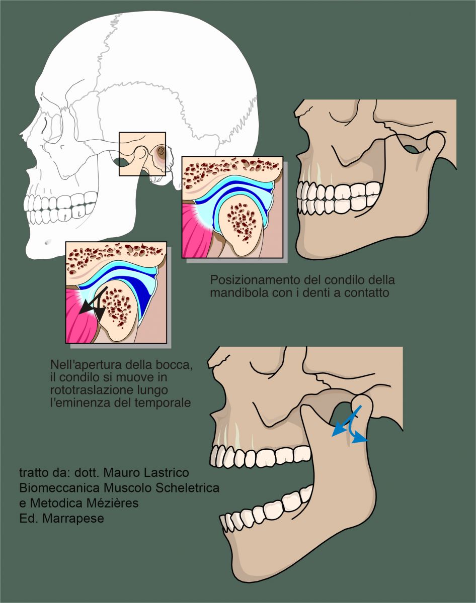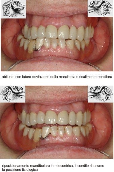 The first consequence will be that the mandibular condyle on the "short" tooth side, to allow contact, will have to position itself beyond the physiological position, towards the temporal fossa. The mandible will thus have a torsional movement.