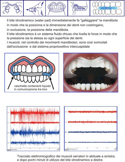 - observe postural variations using a hydraulic bite with communicating vessels, that is a hydrodynamic bite. This type of bite, preventing the patient's habitual dental occlusion, reprograms mandibular movement into muscular equilibrium (reprogramming occurs at each swallowing). If the position of the teeth interferes with posture, sensitive variations in body posture, cervical vertebrae realignment, and hyoid bone repositioning will be observed. Subjectively, the patient may report sensations of well-being in the cranio-cervical area and also in the underlying body districts. The hydrodynamic bite is used during examination and is not a therapeutic means.