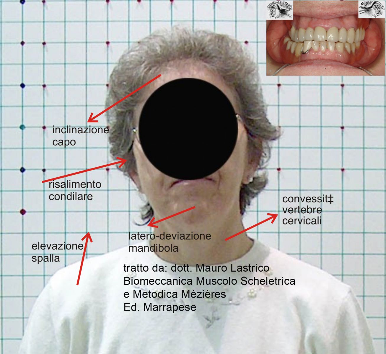If the free space is excessive, for example due to generally "too short" teeth, to maintain a correct free space the masticatory muscles would have to be permanently tense. To compensate for this continuous effort, the muscular system and in particular the muscles in front of the cervical spine, taking a fixed point on the third thoracic vertebra, move the entire head forward, acting synergistically with the scalenes.