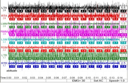 The resting electromyographic tracing of muscles shows hyperactivity and right-left asymmetry: L left, R right, TA anterior temporal, MM masseter, SM sternocleidomastoid, TR upper trapezius bundle.