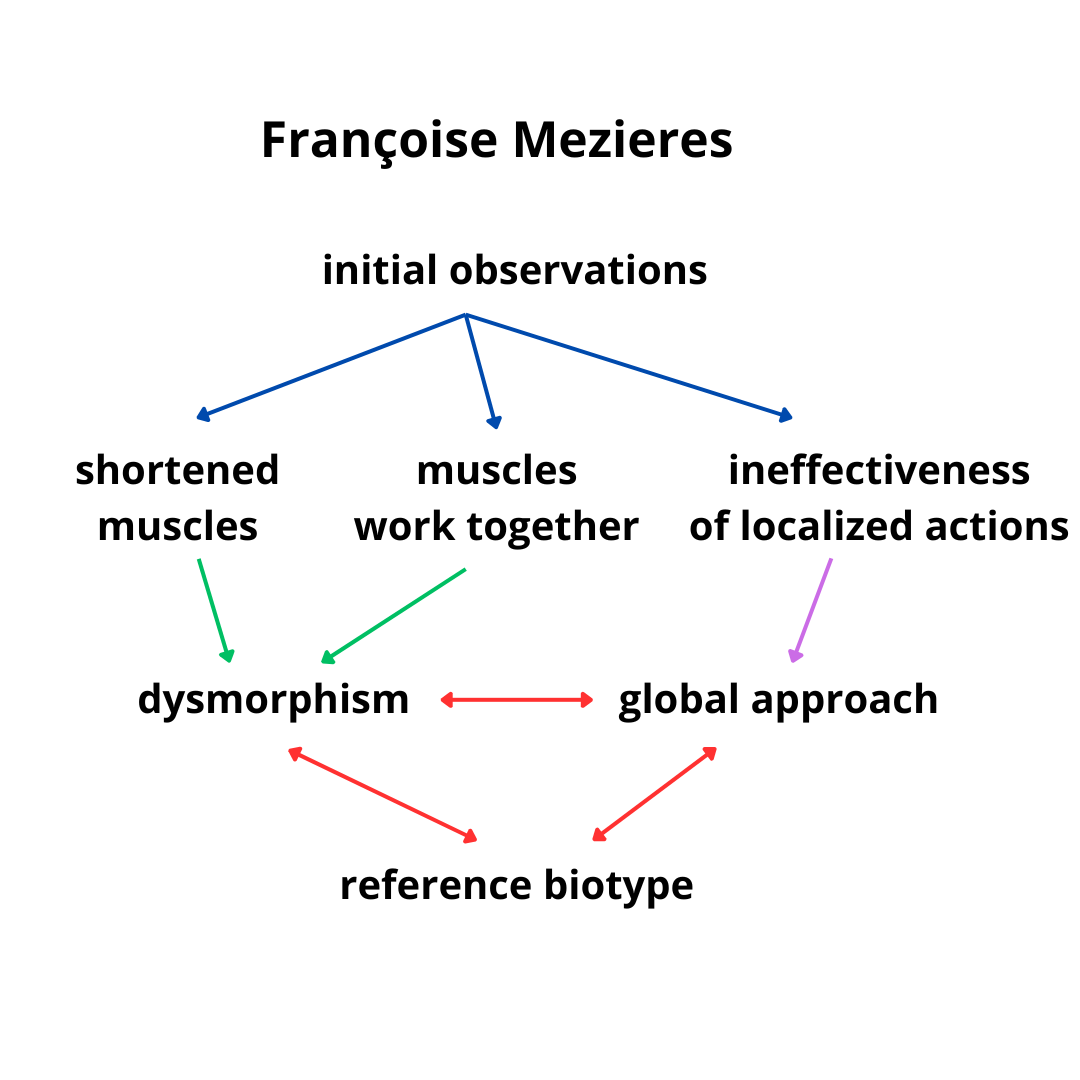 According to Françoise Mézières, it is the musculature organized in chains that influences the skeleton: (therefore) by acting on the first one can correct the second.