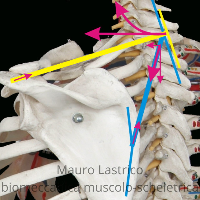 Romboidi e fibre medie del trapezio agiscono direttamente su questo segmento. Il loro accorciamento determina convessità omolaterale con rotazione controlaterale dei corpi vertebrali. La compressione a T2-T3 può produrre dolore al gomito identico a un'epicondilite ma senza causa locale. Confonderne l'origine porta a trattamenti diretti al gomito quando la causa reale è vertebrale.
