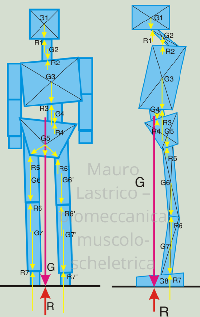 Il corpo umano funziona allo stesso modo. Ogni segmento corporeo ha il proprio baricentro. Se i baricentri segmentari sono disallineati, le componenti g e r si concentrano su superfici articolari ristrette. Il compito del sistema muscolare è mantenere G e R allineate sulla stessa verticale attraverso l'allineamento ottimale dei baricentri segmentari.