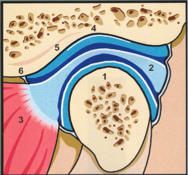 1: CONDILO DELLA MANDIBOLA. 2MENISCO ARTICOLARE. 3CAPO INFRATEMPORALE MUSC. PTERIGOIDEO ESTERNO. 4FOSSA DEL TEMPORALE . 5EMINENZA DEL TEMPORALE. 6CRESTA DEL TEMPORALE