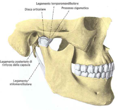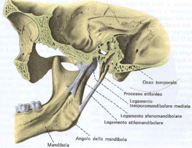 faccia mediale e al margine posteriore del ramo della mandibola. Tra i legamenti estrinseci dell’articolazione può essere annoverato con il nome di legamento pterigomandibolare, un dispositivo aponevrotico che si estende dall’uncino dell’ala mediale del processo pterigoideo dello sfenoide all’estremo posteriore della faccia interna del processo alveolare della mandibola.