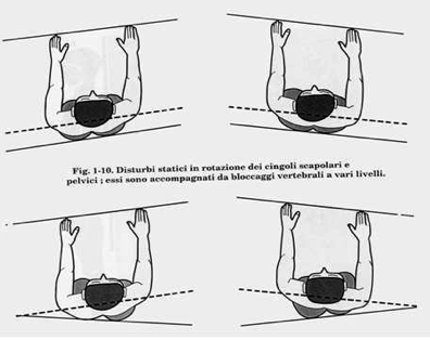 Si ricercano nei tre piani (frontale, sagittale e orizzontale) variazioni di posizione dei principali punti di repere rispetto ad un modello di posizione ortostatica ideale con particolare riferimento al cranio, alla colonna vertebrale, al bacino delle estremità inferiori. Si valuteranno, inoltre, asimmetrie e rotazioni dei segmenti scheletrici nonché la presenza di zone di alterato trofismo e/o tono muscolare.