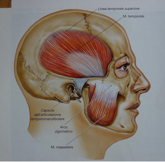 Il massetere è un muscolo di forma rettangolare che si fissa in alto all’arcata zigomatica, in basso alla tuberosità masseterina della faccia laterale del ramo della mandibola. La sua funzione è di sollevare la mandibola e creare tensione nell’occlusione delle arcate dentarie.