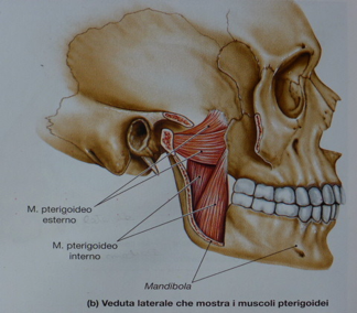 Il pterigoideo interno origina dalla fossa pterigoidea e dalla tuberosità del mascellare e si inserisce sulla tuberosità pterigoidea, in prossimità della faccia interna dell’angolo della mandibola. La sua funzione è di innalzare la mandibola.
