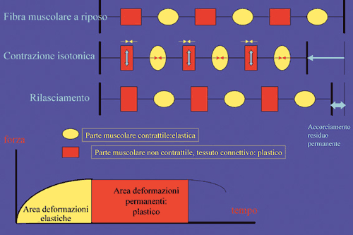 Lla fibra muscolare è composta da una sequenza di parti contrattili e di parti non contrattili (quest’ultime di tessuto connettivo). Facendo riferimento alle leggi fisiche sulle deformazioni dei corpi elastici e plastici, risulta che le componenti contrattili della fibra muscolare si comportano come elementi elastici; di conseguenza dopo la deformazione in compressione dovuta alla contrazione tornano sostanzialmente nelle condizioni di partenza. Al contrario le componenti non contrattili di tessuto connettivo si comportano come materiali plastici, ne consegue che se una deformazione in compressione avverrà con una forza e per un tempo sufficienti a superare la soglia della curva delle deformazioni elastiche entrando in quella delle deformazioni permanenti, al tessuto connettivo residuerà una deformazione permanente in accorciamento.