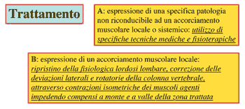 In questo caso il trattamento potrà avvalersi della metodica Mézières che avrà come obiettivo il ripristino della fisiologica lordosi lombare, la correzione delle deviazioni laterali e rotatorie della colonna vertebrale, attraverso contrazioni isometriche in massimo allungamento dei muscoli agenti impedendo compensi a monte e a valle della zona trattata