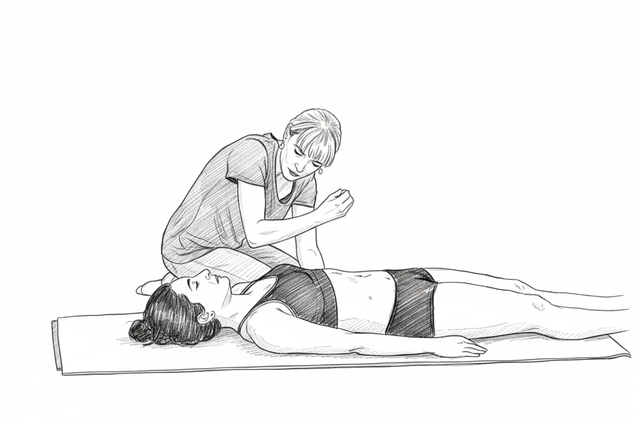 Seduta Metodo Mézières: fisioterapista guida paziente in postura terapeutica