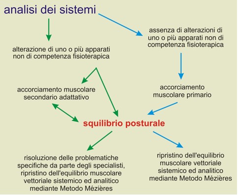 - espressione di accorciamento muscolare sistemico primario o secondario, originato od originante disequilibrio posturale: in questo caso si ricorrerà all'analisi posturale, con verifica della eventuale presenza di alterazioni provenienti da sottosistemi non riguardanti il campo fisioterapico, e al riequilibrio vettoriale muscolare analitico e sistemico