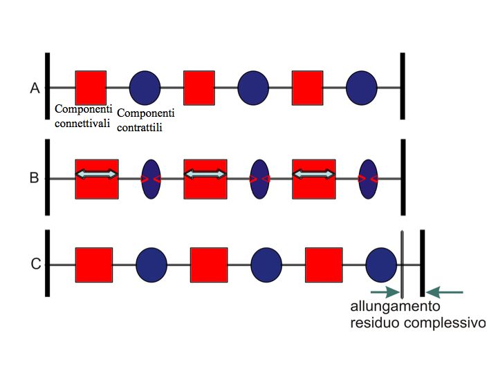 "A" rappresenta la fibra muscolare posta in massimo allungamento fisiologico o relativo; "B" la contrazione attiva: le porzioni contrattili in blu si modificano in accorciamento attivo ed esercitano una trazione sulle parti connettivali in rosso; in "C", a fine contrazione, in funzione della forza e tempo di contrazione, ogni singola componente connettivale avrà subito una deformazione in allungamento e le frecce verdi rappresentano la loro sommatoria.