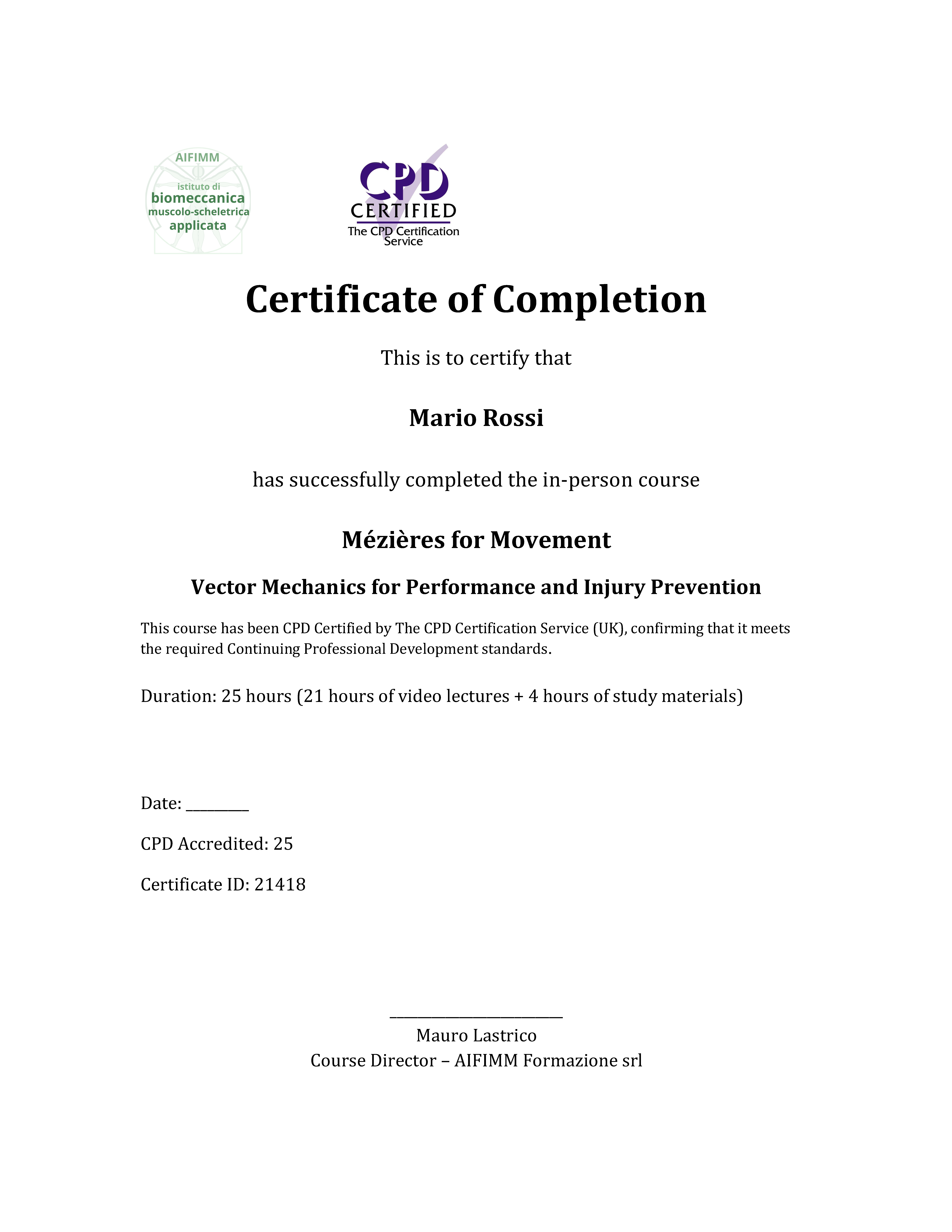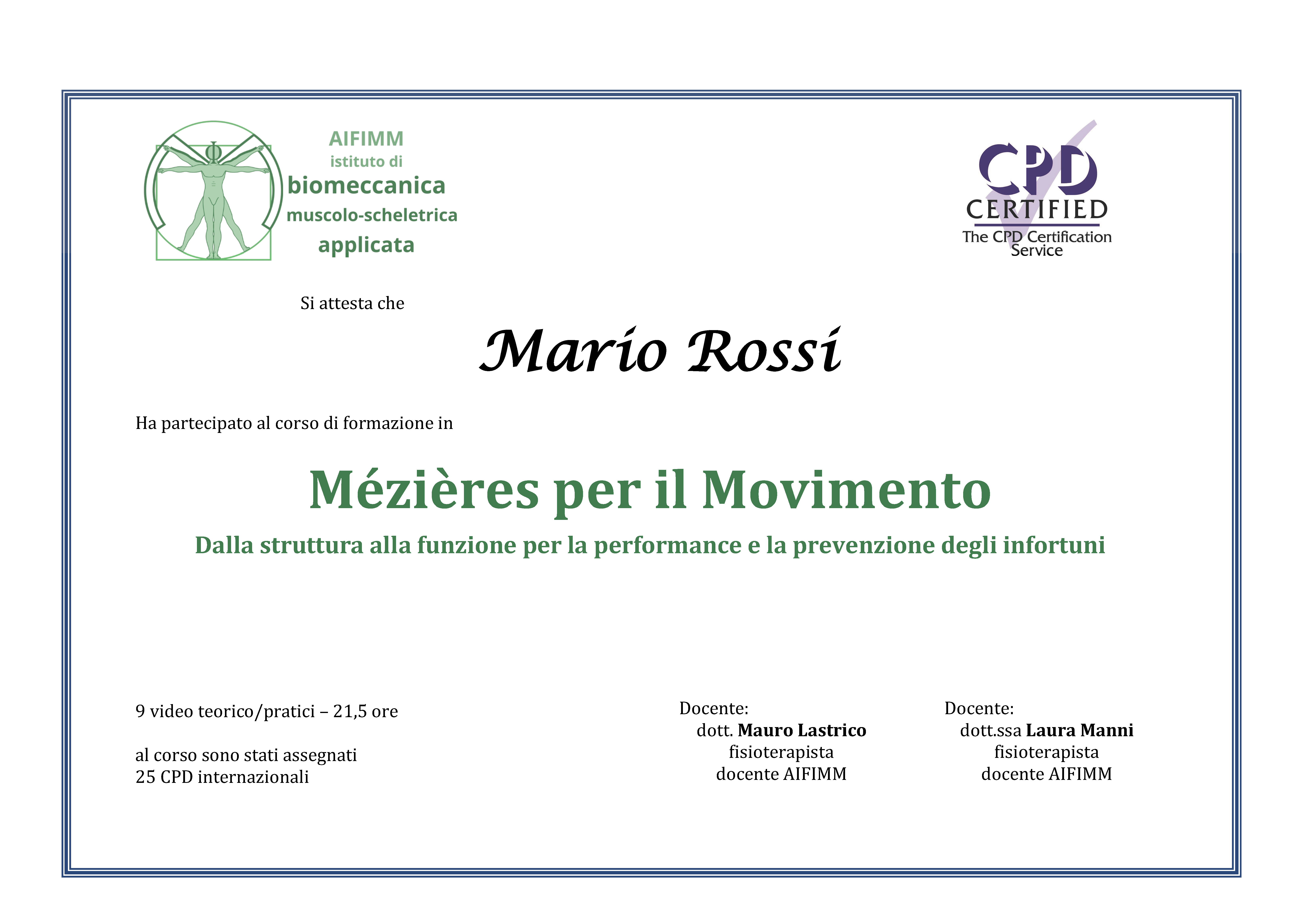 Certificato CPD con la seguente valutazione: "...un framework strutturato per analizzare i vettori di forza muscolare, identificare le strategie compensatorie e applicare il lavoro isometrico al fine di migliorare l'efficienza del movimento...."